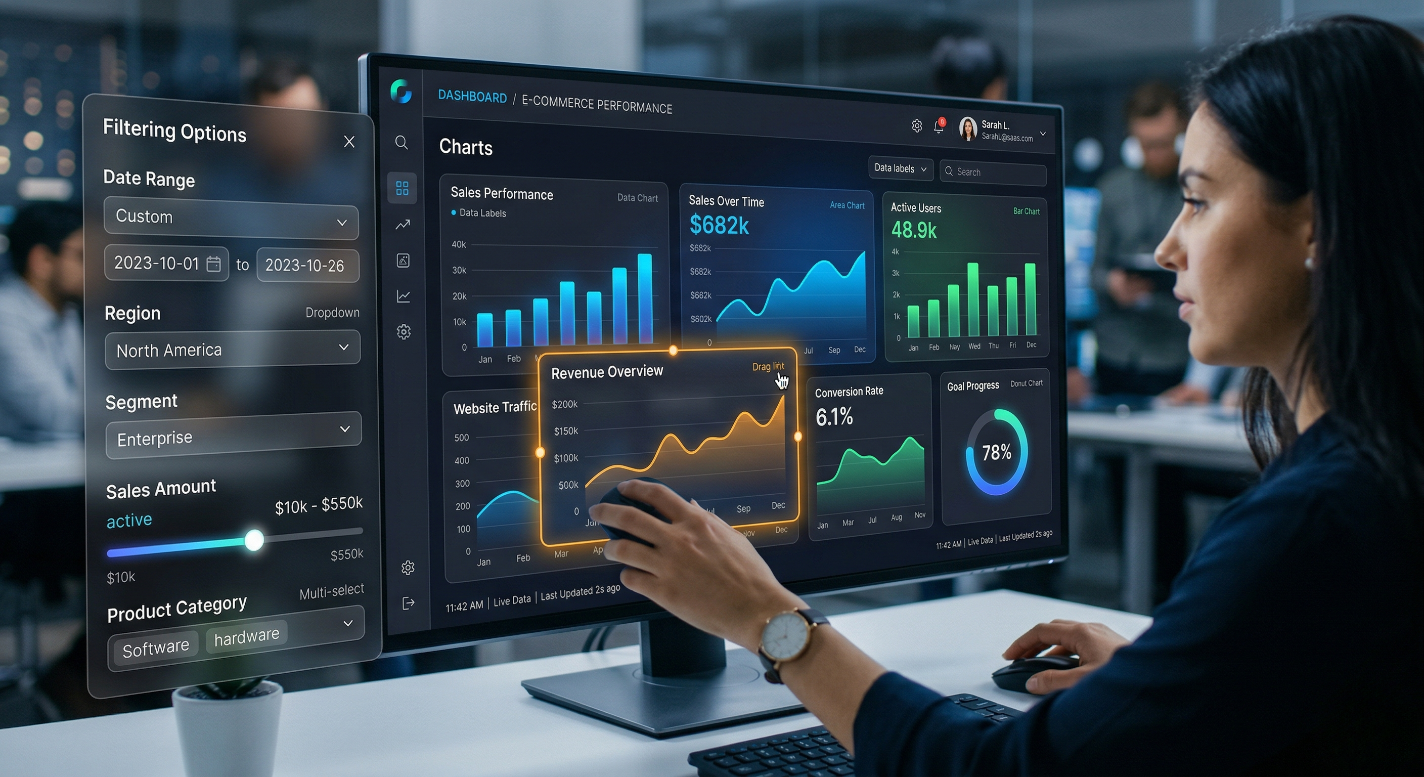 Our analytics dashboard aggregates data from multiple sources and presents it in an interactive interface using high-fidelity charts, graphs, and live performance indicators.
